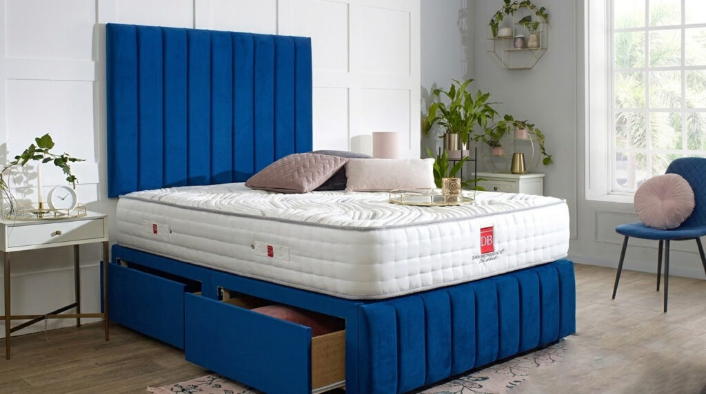 This luxurious platform Divan Bed is made from the highest quality British timber right here in the United Kingdom. It is presented in stylish material, designed to be the perfect addition to your bedroom. Available in many different colours and fabrics.The base features 4 beautifully positioned chrome gliders on the base itself add a touch of style and elegance to your room. Also includes a luxurious, comfy mattress.